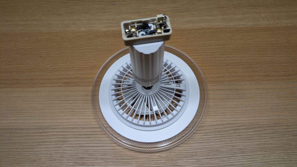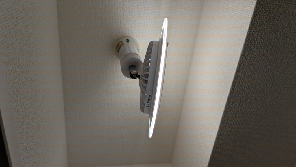 ファンと照明部の根本がジョイントになっているので、好きな方向に傾けられます。