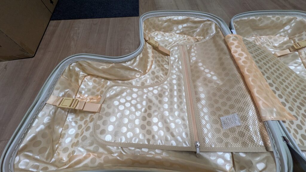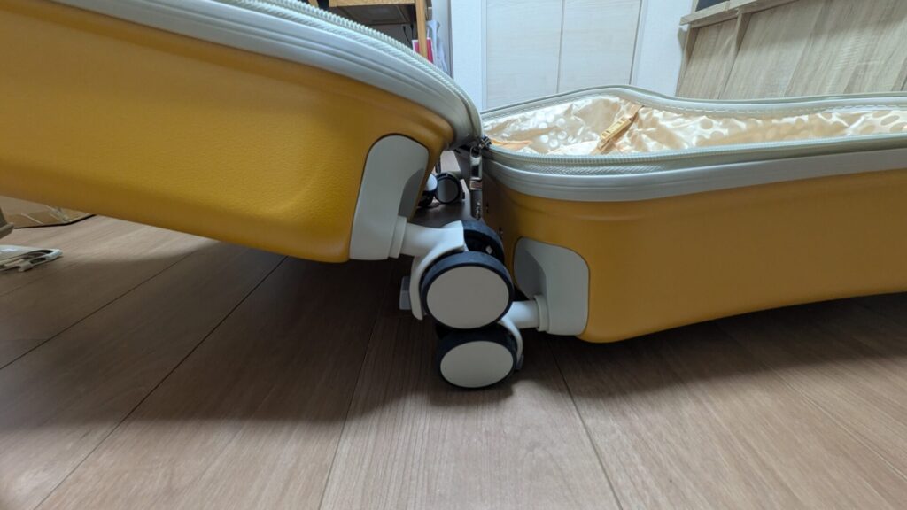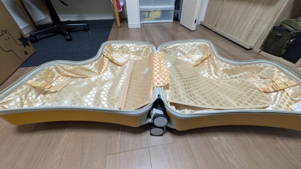 内装はハデハデなゴールドの水玉模様!非日常感があってワクワクしますね。 内容量は64L。一点注意なのが、何も考えずに開くとキャスター同士が干渉して変な角度で止まること。フルオープンにするにはキャスターを重ね合わせるコツがいりますが、慣れれば問題ありません。