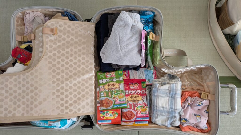 子供が小さいこともあり、これだけ入れてもかなり余裕があります。詰め込めば大人の服も入りそうです。我が家はカメラ機材(三脚やレンズ)も持っていくので別のケースと併用しましたが、荷物が少なめのご家庭ならノリッコ1個でもいけるかもしれません。