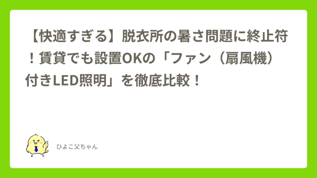 レビュー 【快適すぎる】脱衣所の暑さ問題に終止符!賃貸でも設置OKの「ファン(扇風機)付きLED照明」を徹底比較! 2025年9月26日 ひよこ父ちゃん ひよこファミリーブログ こんにちは。ひよこ父です。 今年の夏も暑かったですね。全国的に年々暑くなっている気がします。 今回は灼熱の夏に我が家で大活躍し …